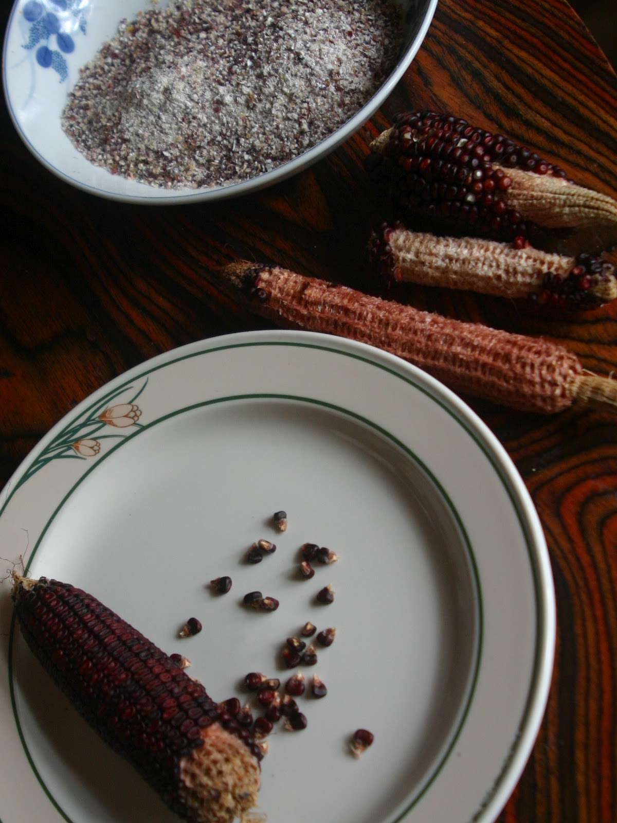 Another garden victory was that although we got only a very small amount of dent corn from the garden this year–unfortunately a lot of it was moldy from all the rain–I actually made use of it. I shelled it and ground it in our corn mill and made some pinkish corn bread. We still have a few more blue and purple cobs–they are all the same kind of butcher corn, but it comes in many different colors.