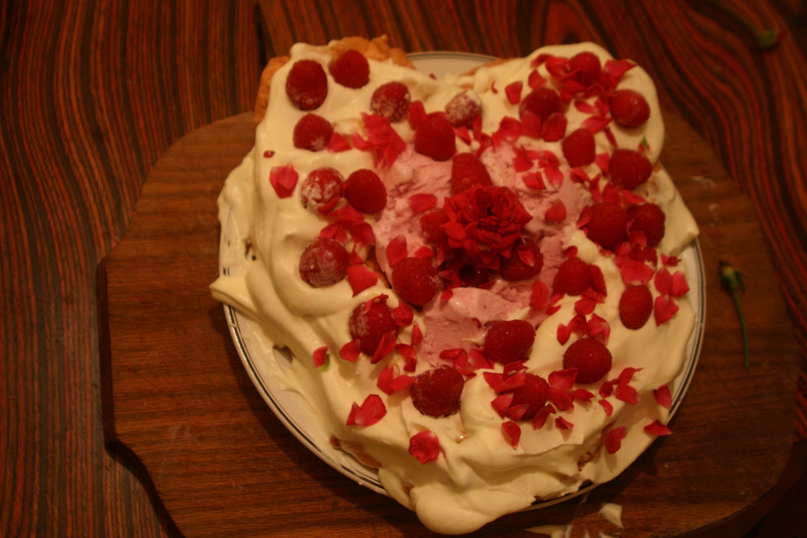 This was the first cake Mirin’s ever made–it was a meringue made with our eggs and cream with raspberries (from the store–alas! I wish we could grow raspberries!).