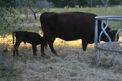 The calf was nursing while Geranium was eating hay–so cute!