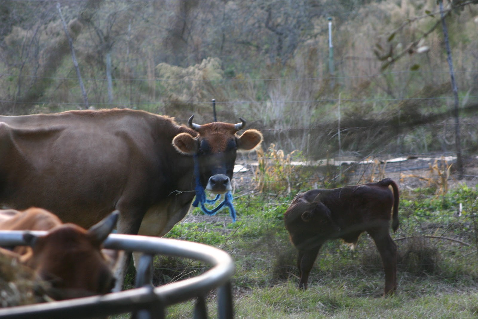 I can tell she’s going to be a really good mama. She knew just what to do. He was already starting to hop around playfully. The other calves were there, too, and spent a lot of time running around with their tails up and playing with the dog. Geranium made a fuss about this at first (she hates the dog), but they all ignored her and kept playing.