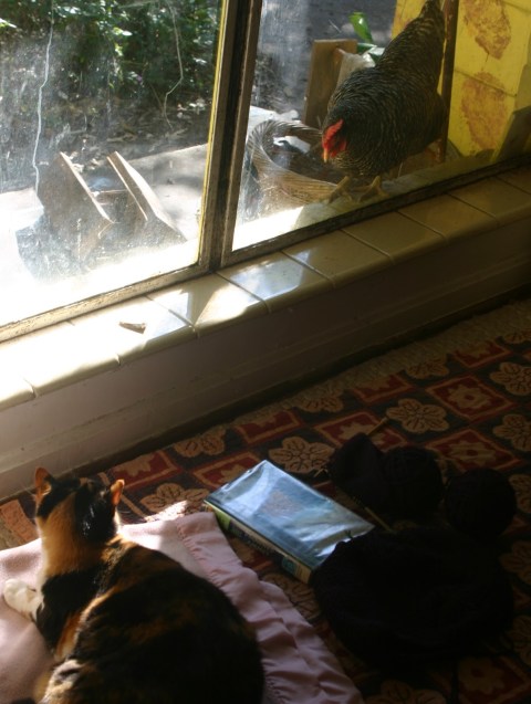 Penny, our pet chicken who is not really supposed to be in the front yard, but keeps getting out today, decided to join in with us through the window!