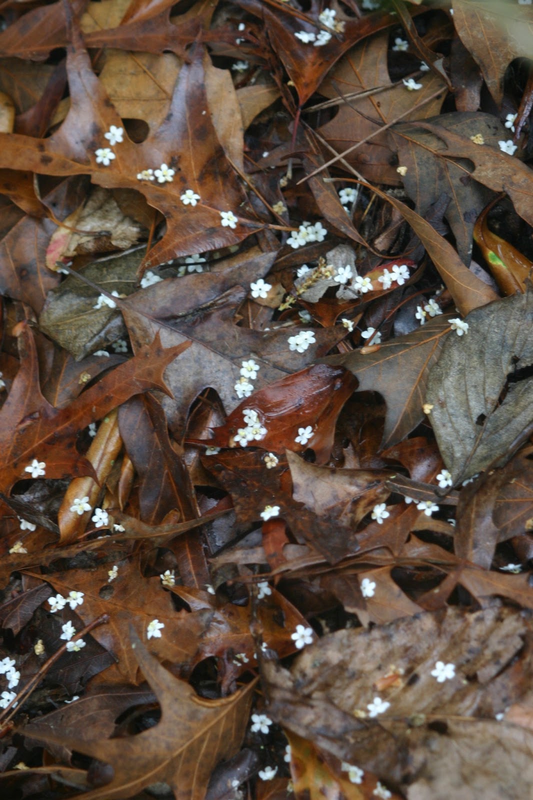Here were vibernum flowers, like little stars, among the red oak leaves in the yard.