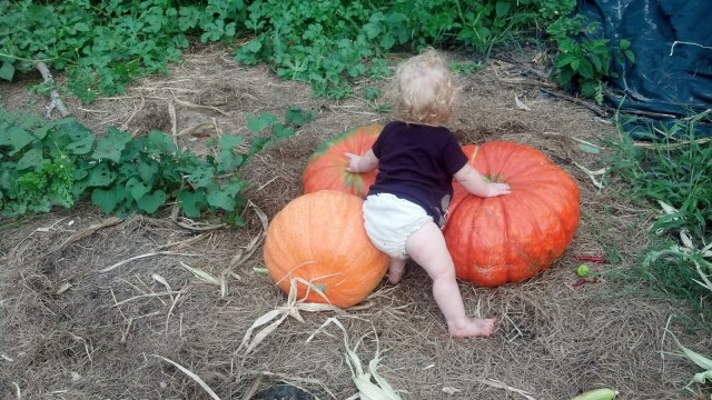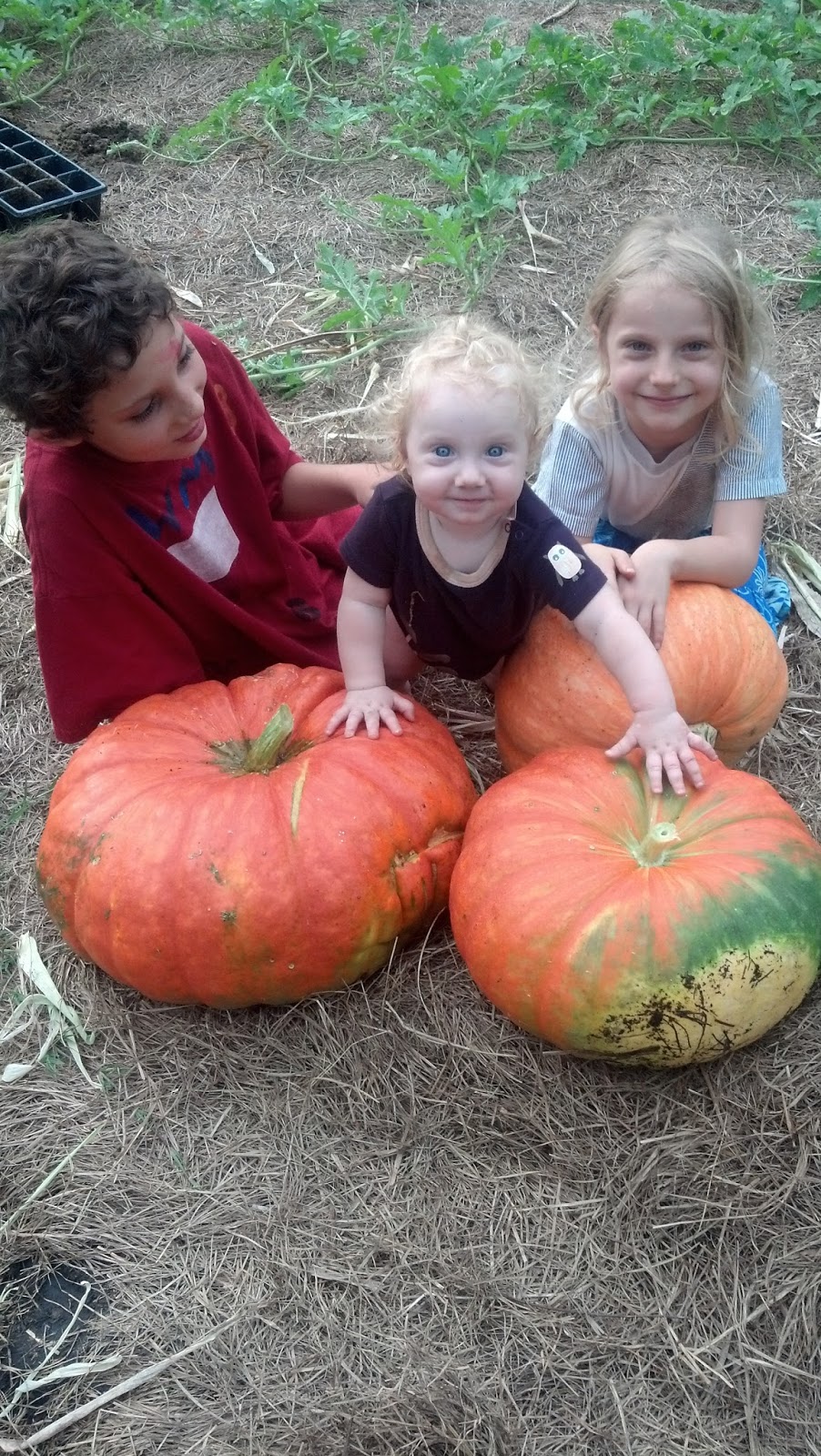 The next day, Mirin and Rose came out. I had saved the largest pumpkins for them to pick, and they ran excitedly through the rows of fading sweet corn to pull them out.