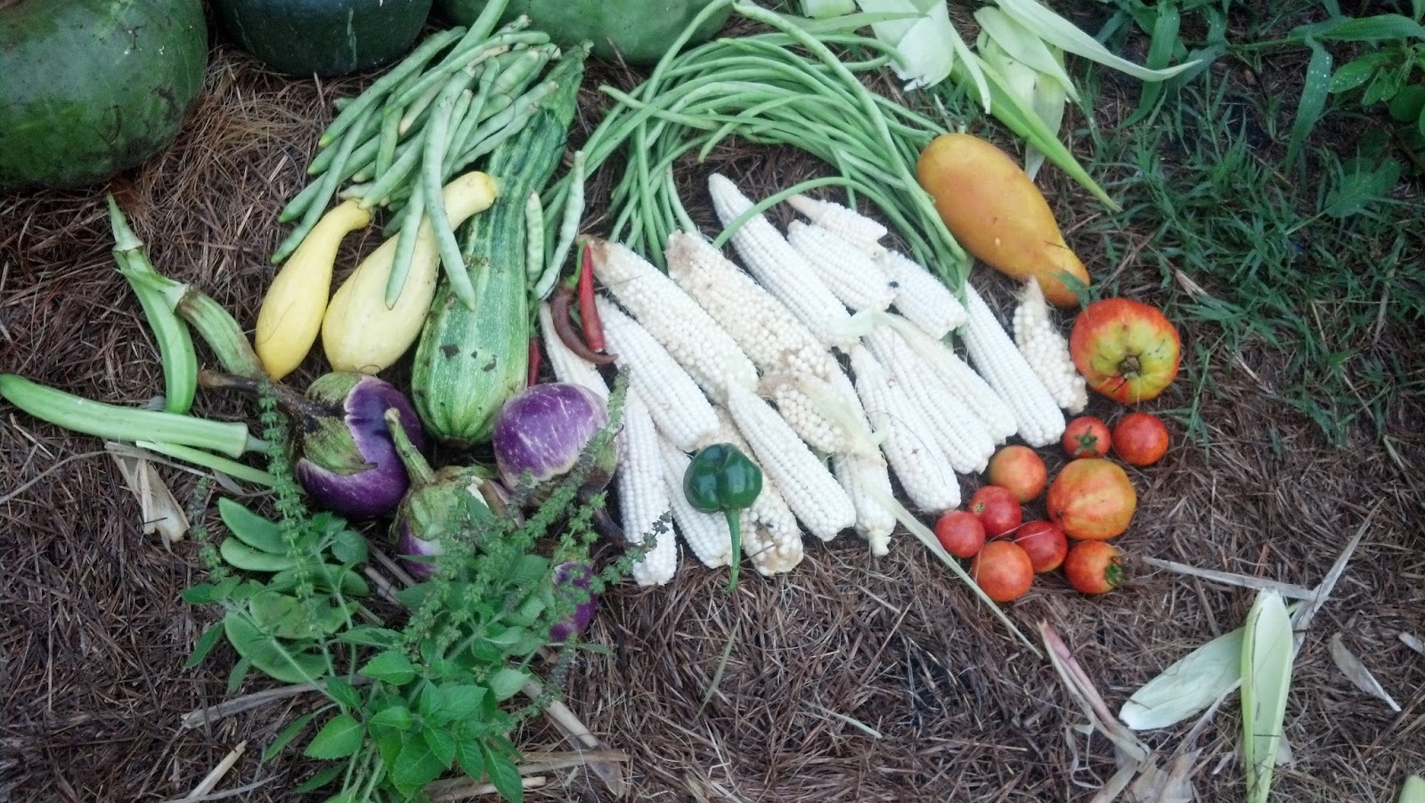 The last of the sweet corn, cow peas, long beans; a huge, hidden cucumber, eggplant, a massive marrow we had missed, some okra, a few yellow squash, some ailing tomatoes and Tulsi, or Holy Basil for tea. We are finding it very refreshing during these very hot late summer days.