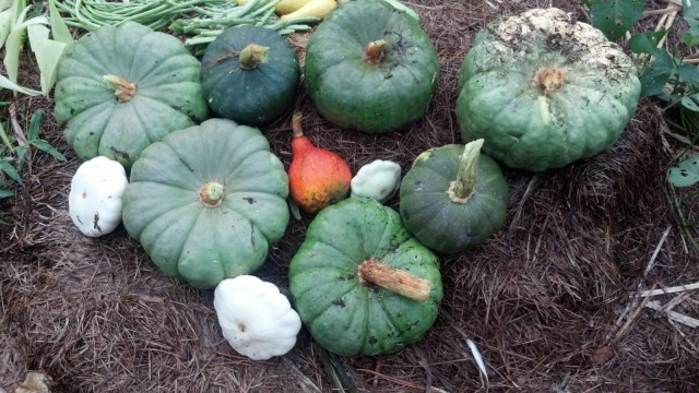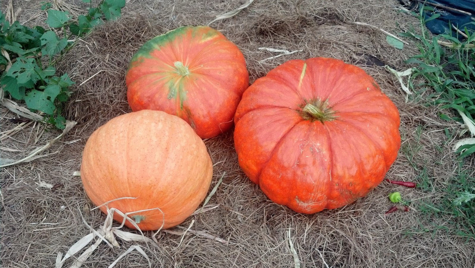 I love Cinderella pumpkins (or were these Rouge Vif D’etamps?), and my only Amish Pie pumpkin we got this year. The vine is still setting more fruit, but I’m afraid the stem borer moths will likely get them before we do.