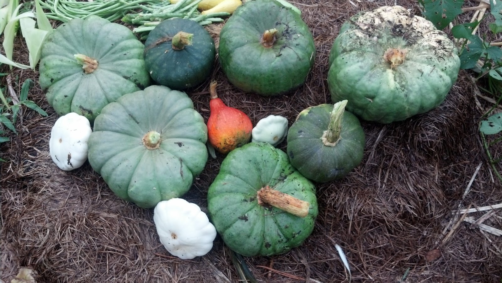 It was time to harvest the pumpkins last week. We got a Potimarron (little orange one), a Burgess Buttercup (dark green, second from left in top row), a small Strawberry Crown, but mostly we got pumpkins from a volunteer pumpkin vine. They are some sort of blue pumpkin, and they are very sweet-flavored. I am wondering if it is a Triamble-Australian Butter Pumpkin cross, or perhaps a Strawberry Crown-Burgess cross? I planted so many different kinds last year, we will never know.