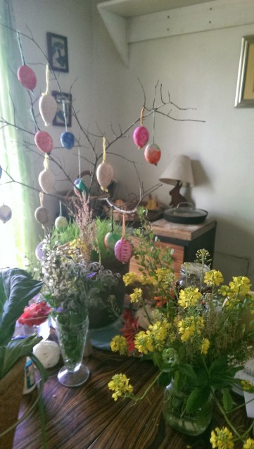 This spring our table is decorated with spring flowers and an Ostara tree. We had lots of fun blowing the eggs and painting them on the Equinox.