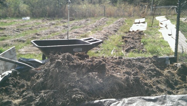 Thanks to our friend Danny, we found a wonderful source of horse manure. It’s a horse-boarding place, there’s tons and tons of it, and they are so happy for us to haul it away. We also found some huge pieces of cardboard, so garden construction is underway.