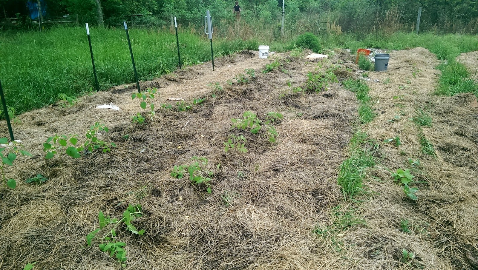 The summer garden has been started! It’s like the first day of school putting the tomato starts out there – all by themselves and exposed to the elements and the harsh, cruel world. I worried about them, but they survived the latest gusty cold front and are putting on some new growth already. The eggplants had a close scrape. The sprinkler was badly adjusted, and they weren’t watered in well enough, but even they seem to have recovered and are settling in nicely.