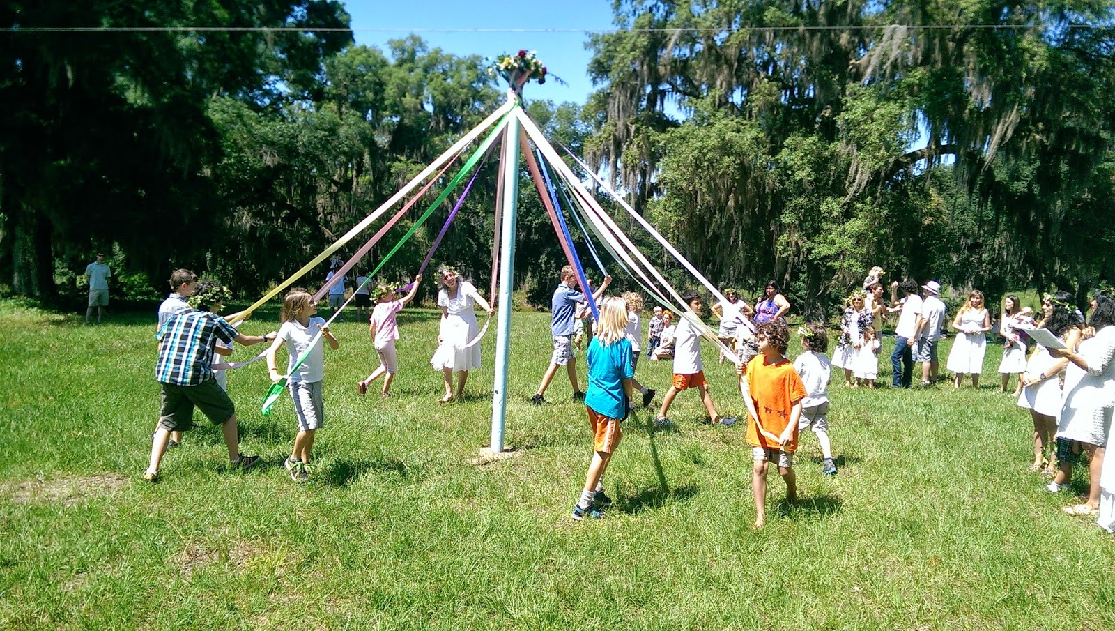 Mirin was not expecting to be part of a may pole dance, so he ignored us telling him that the “dress code” was white with a flower crown. He did wear the crown he had made earlier, but refused to put on a different T-shirt, so he was the kid wearing deer-hunter orange when his old teacher from Heart Pine School had him join in. At least he was not completely alone.