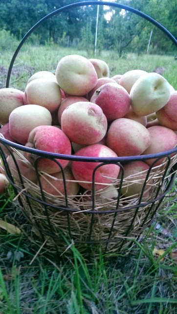 Then suddenly one day I looked and realized they were all red and ripe. Some of them were even starting to spoil. We had to put other things aside and pick them right then and there. We got so many peaches off of that one tree. I didn’t count them, but they completely filled our egg basket and we still had to find a spot in the milking basket to bring even more home.