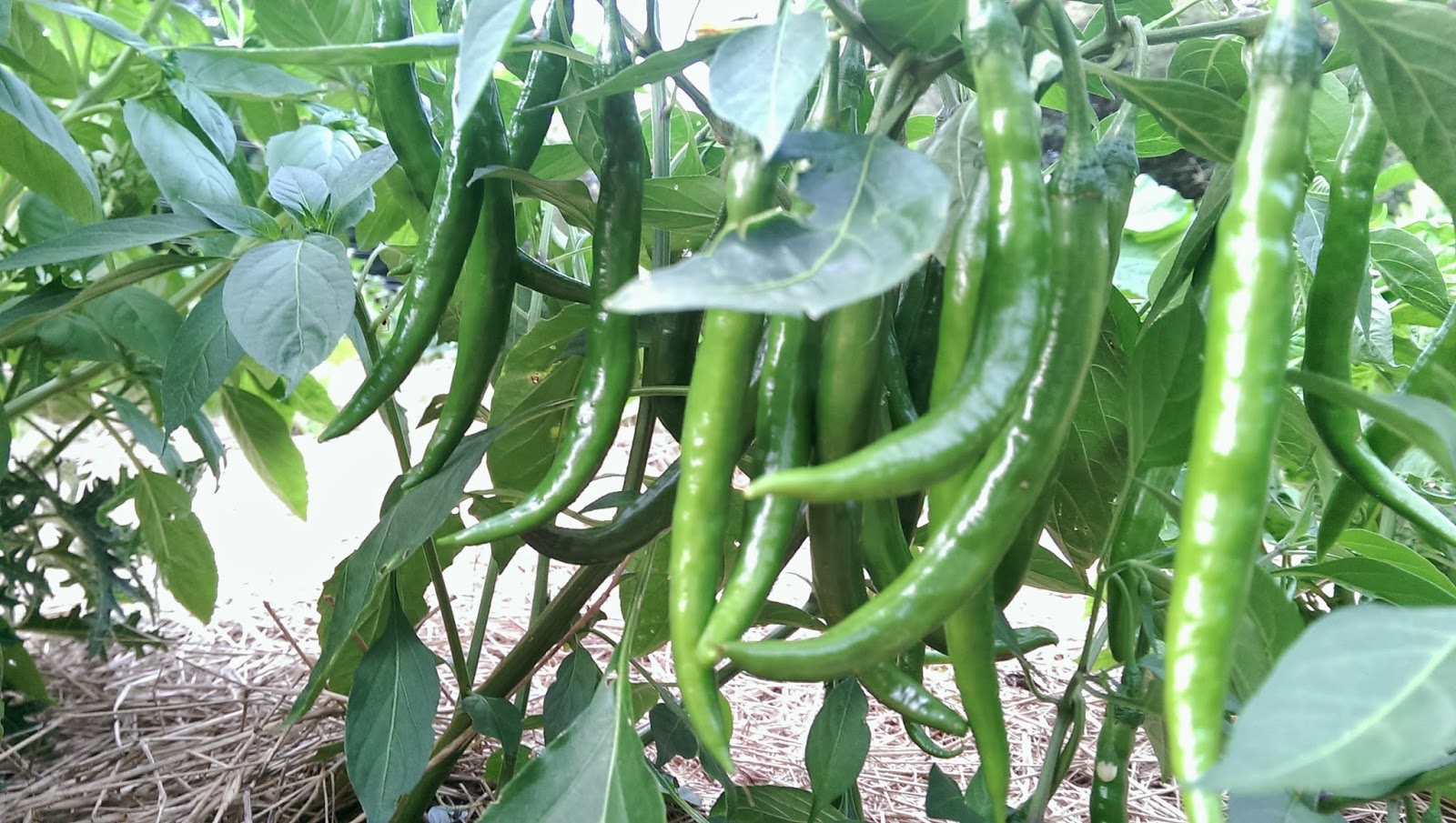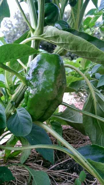 The peppers are starting to come in. All still green, of course, like the tomatoes, but it won’t be long now. I still have some dried cayenne from last year, but we are looking forward to fresh sweet peppers, so different from the rubbery store counterparts.