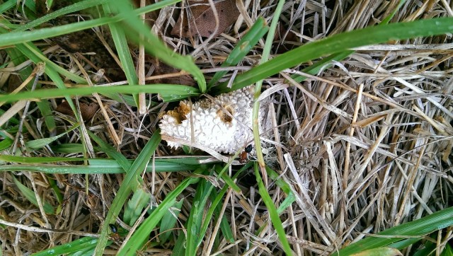 This fungus was at the farm and was being grazed by big ants. You can see one on it near the bottom. I think they look like carpenter ants. Some sort of stinkhorn fungus, perhaps?
