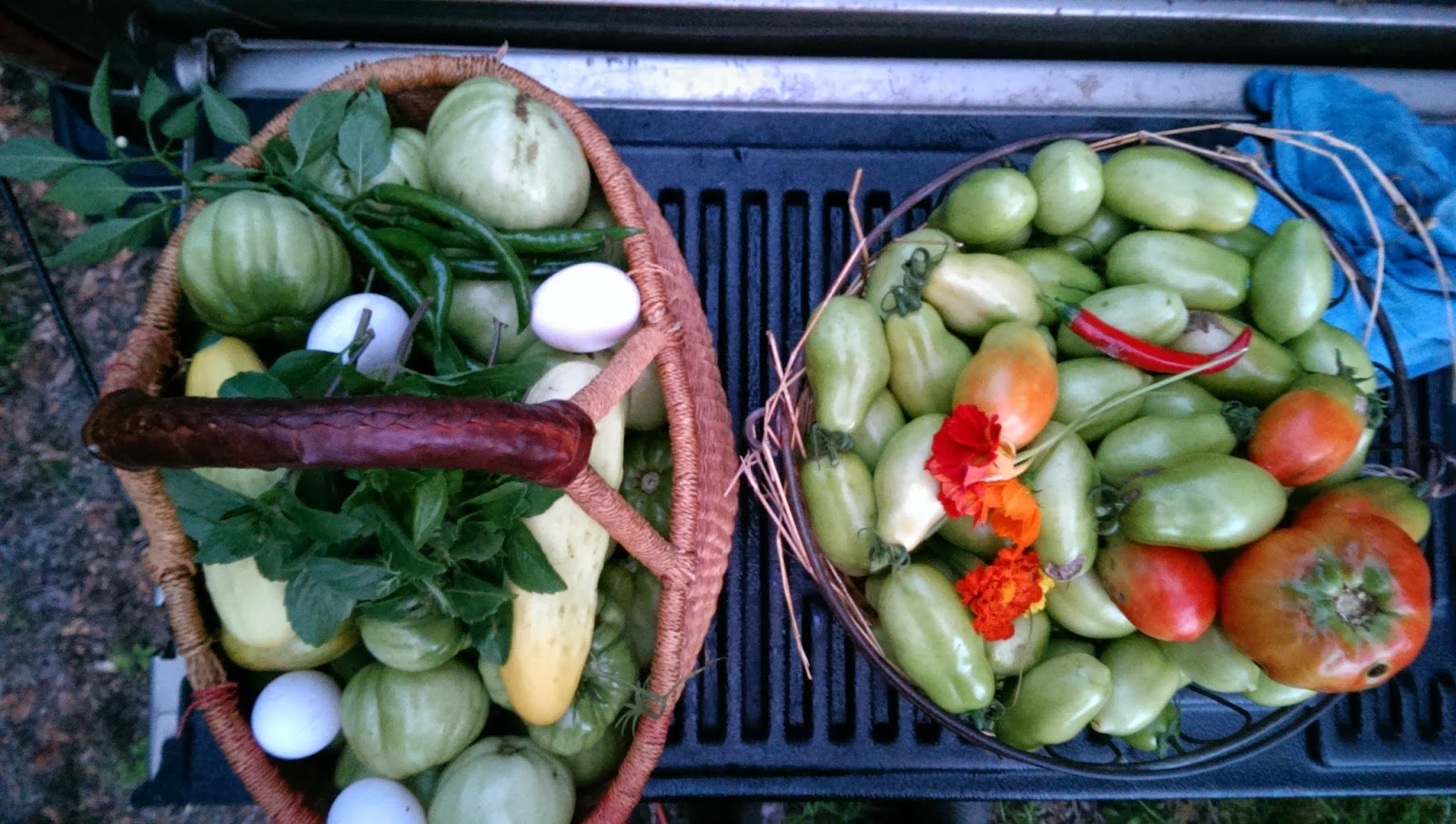 Well, there are a LOT of green tomatoes.  It was more than the baskets could handle, and the real estate on the kitchen table is getting scarce, but there’s talk of putting the leaf in to lay them out to ripen.  I think we’ll have some fried green tomatoes for breakfast this morning.
