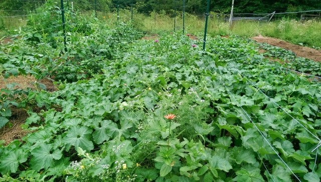 With all the rain (FIVE inches last week!!  Well, at least according to our rain gauge) the garden is getting jungley.   I don’t think I will bother companion planting flowers with the melons next year – the pretty cactus rose zinnias look like they’re drowning in melon vines.  The melons didn’t trellis like the cucumbers, but I think I missed a critical trellising point with them when I should have encouraged them more.