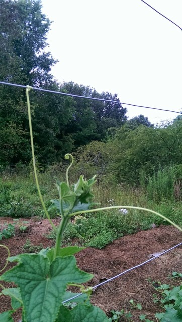 The cucumbers had no problem grasping trellising (sorry, awful pun).  I love this little vine with an anthropomorphic look.