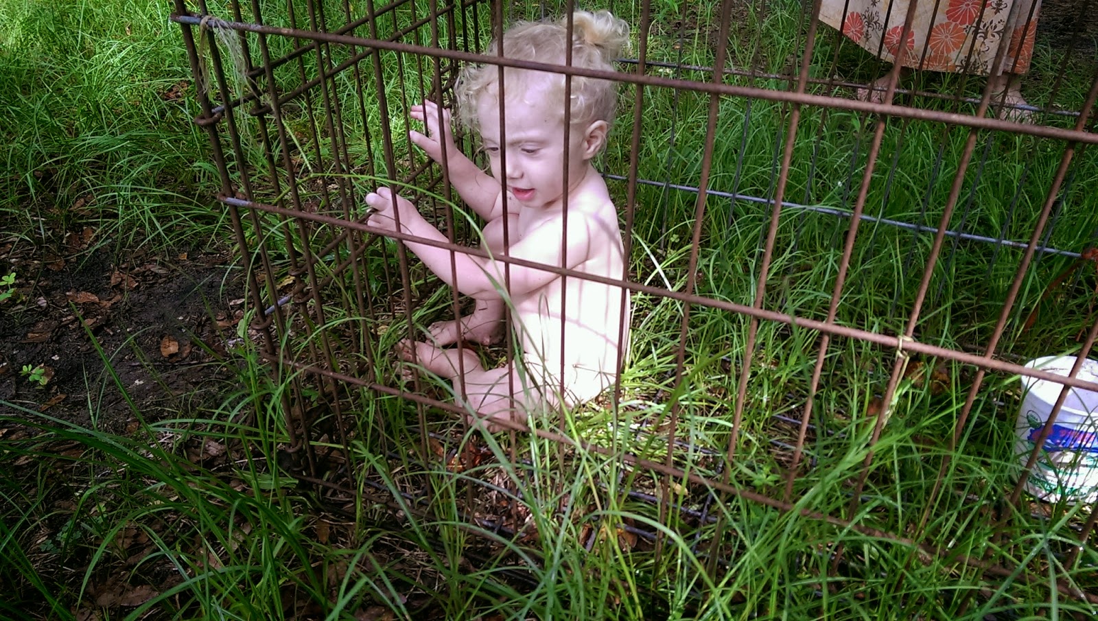 It always surprises me what becomes a favorite kid toy. Of course there’s the old story of the kid ignoring the toy and playing with the cardboard box it came in. The cage is somehow irresistible that way. Even Clothilde has fallen for it’s magical, rusty charm. It’s great to climb on, fun to sit in and shut the door (for some reason), and is so rusty it isn’t easily locked, so it’s not really possible to lock yourself in. Even the big brother can’t easily lock up the little sister, even when she begs him to for a game.