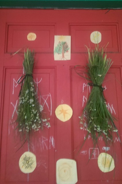 Drawing on an old Rhythm of the Home article (goodness, I miss it so much!) I created a little celebration for us yesterday. We made a grain-free Solstice cake to eat with our summer blueberries (I love the way the recipe calls for FIVE eggs perfect for this time of year when the egg basket is overflowing). We also gathered bunches of long summer grass to hang on the door, along with little sun pictures we drew. We sang our best sun songs and hung sprigs of St. John’s Wort over the doors while I told a few little stories about troublesome, naughty fairies. The children all really liked it. If I have more time and energy next year (please!!) I would like to add making candles, too. I like the idea of capturing all the bright solstice light to bring with us into the shorter days. I am also going to make some boiled sweet corn for dinner tonight – alas, not from our garden. It was a sacrifice we had to make this year so we could grow out the Dudley farm corn.