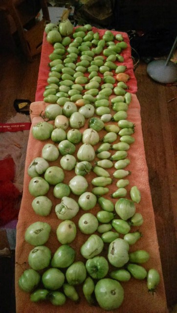 The peppers are also needing to be picked.  I’m afraid I accidentally set off my friend Karl’s hot pepper ego the other day when I tried to give him a few of the Czechoslovakian black peppers, saying they were not terribly spicy, but just had a touch of spice, but if you take the seeds out it is almost a sweet pepper.  That inspired him to take a tiny bite of the least-spicy part and go on and on to me about how wimpy I was if I thought that was a hot pepper and an exhaustive list of all the peppers HE likes to eat.  Sheesh!  Some people!  I am so tempted to grow some ghost peppers next year and make a special, completely inedible hot sauce just for him, and invite him over to dinner so we can watch him turn purple while he tries to say how not-spicy the sauce is.  Well, maybe that would be mean.  But he would definitely deserve it.