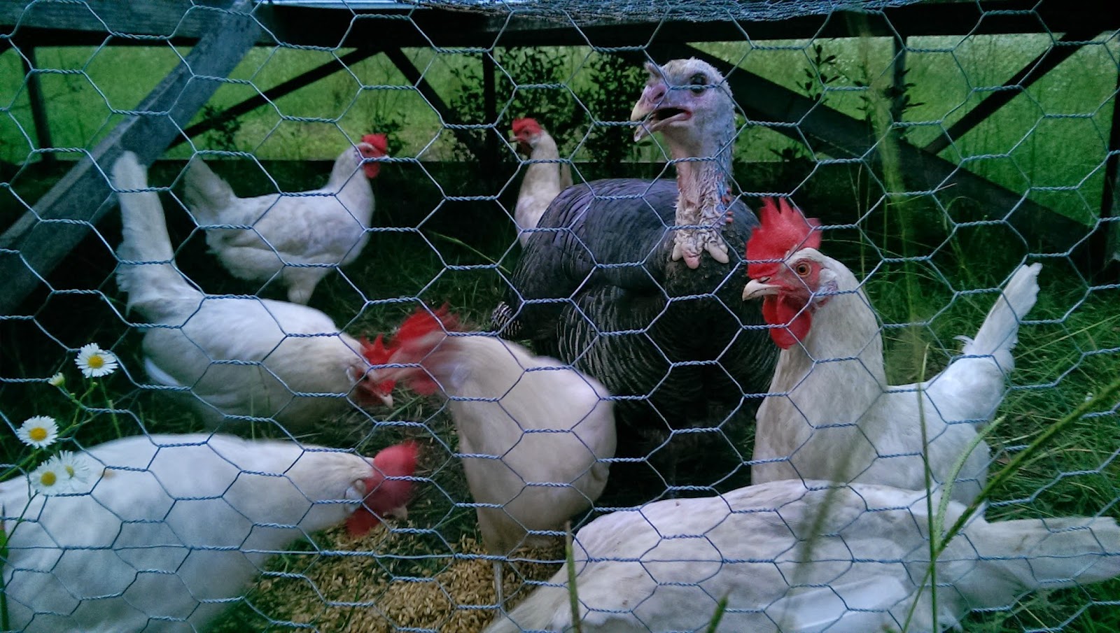 Just the layers and our pet turkey, Gorgeous. She was one of the birds we had raised for Thanksgiving two years ago, but we never ate. She’s in with the layers and has become a “laying turkey” for now. We do get a lot of eggs from her every year, and they are huge eggs, too, so she probably earns most of her keep. The wild turkeys like her and are always hanging out near the chicken tractor to catch some extra oats and whistle to Gorgeous. We have tons of wild turkey mamas out there right now with little poults following along.