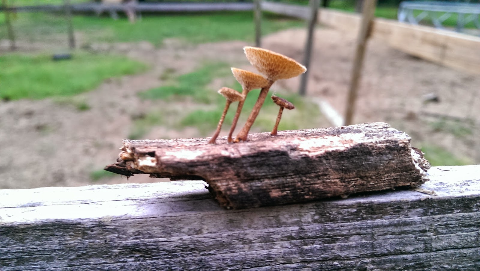 I found these four little mushrooms on a rotting piece of old pallet in the milking paddock. They look like they’re singing a song! Interestingly, they didn’t have gills, they had netted-looking pores. Of course I’m not sure at all what kind they are – the LBM type I would guess (little brown mushroom).