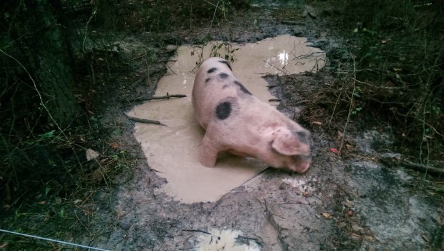 There’s been so much rain lately, the pig’s wallow is twice the usual size.