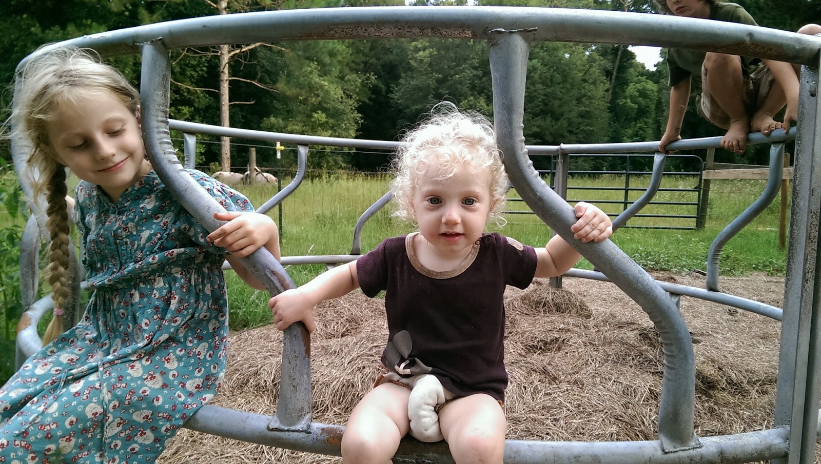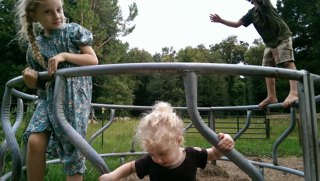In this season of abundant grass, the hay ring has been re-purposed as a play structure.