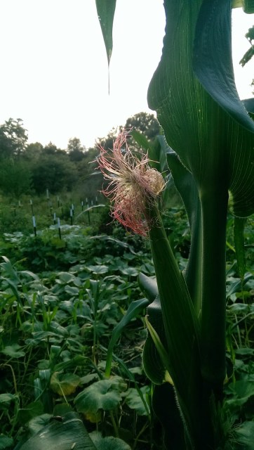 The corn is not only tasseling, but little ear tufts are out, too! These seem to have appeared overnight. I was even watching for them carefully this year. (you can get a little glimpse of the incredible jungle of squash vines in the background there).