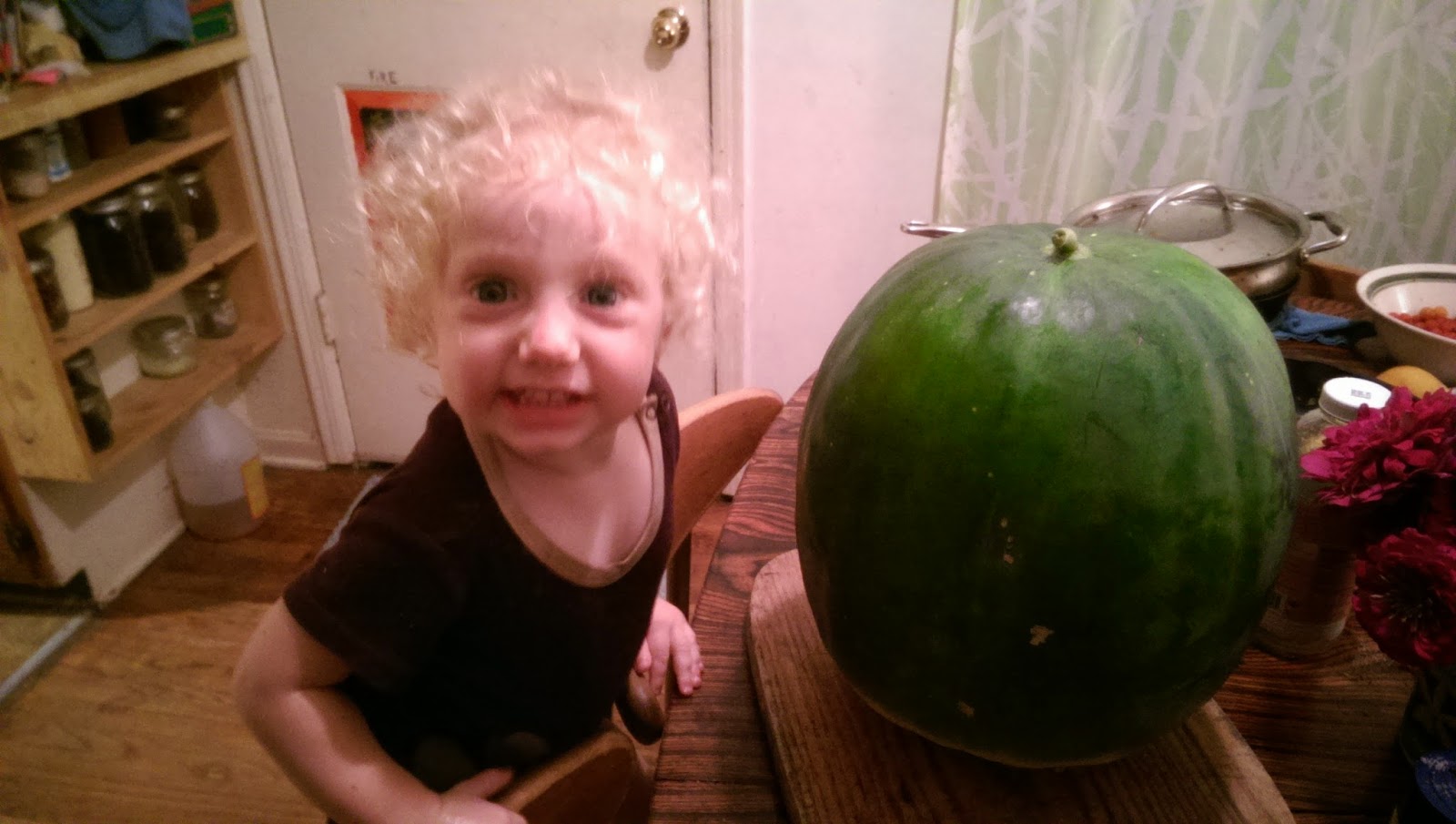 We got the first watermelon, too! I grew the Van Doren Moon and Stars this year. They are huge. It was not quite perfectly ripe, but it was still very sweet. We still have a hard time telling when melons are ready to be picked. It has been so wet, we thought it would be better to pick it a little early rather than later in case it exploded or cracked. We’ve had that happen before! This melon left an incredible crater in the mulch where it grew.
