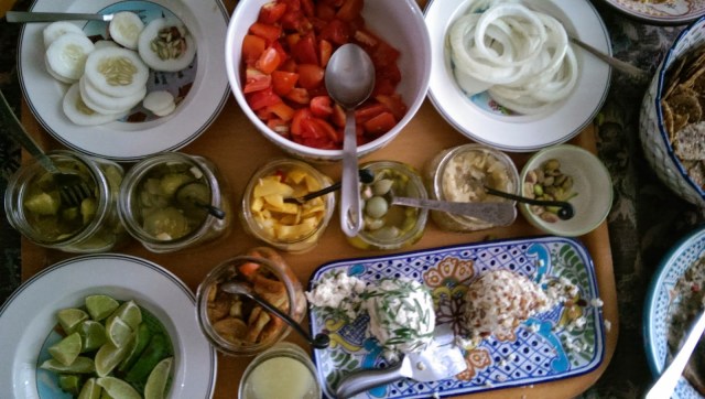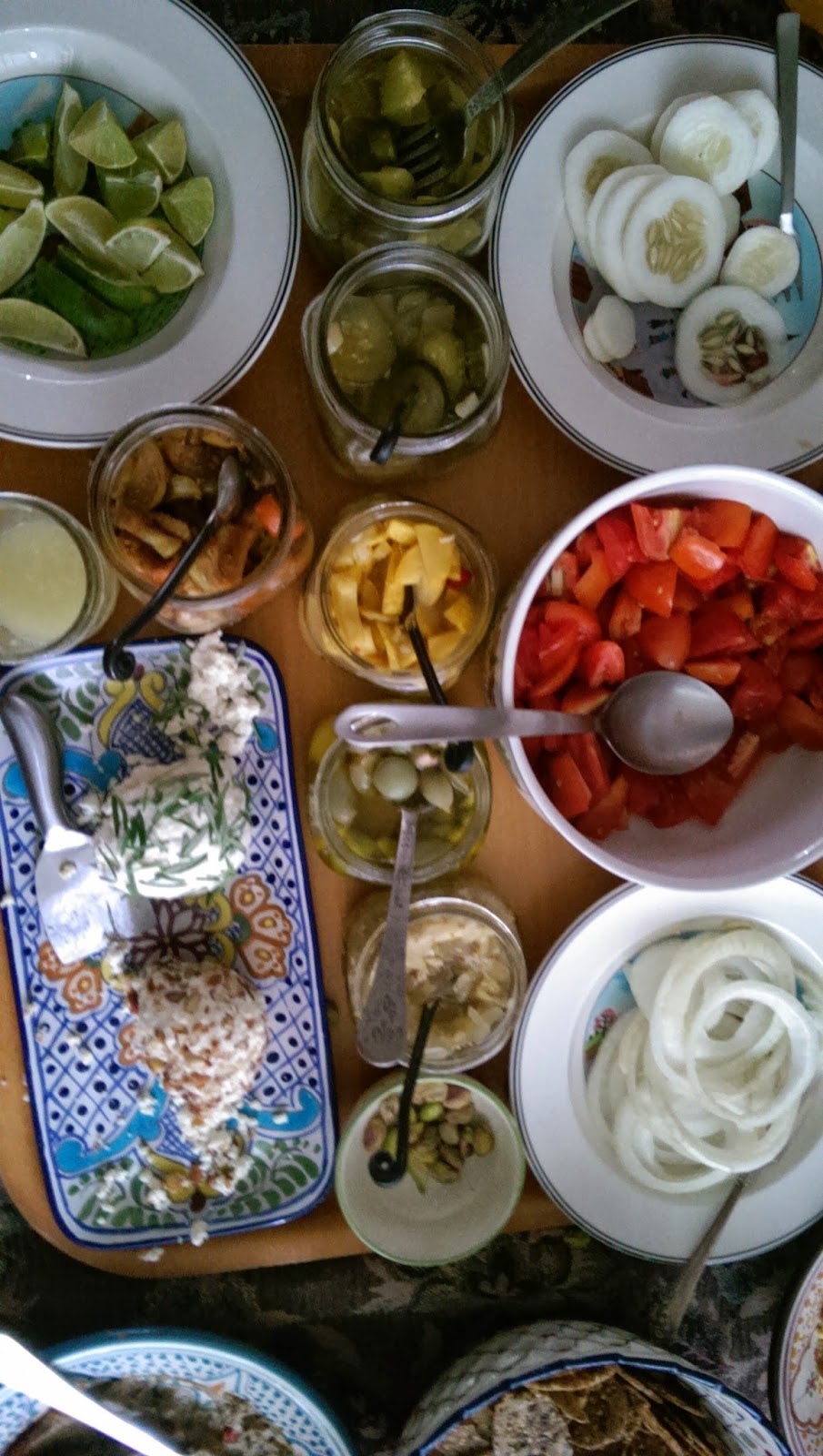 With all four baby boy goats now in the freezer and lots of eggplant, cucumber and pumpkin from the garden, my mom hosted a Persian feast with a bunch of friends from Iran. This was the Mokhalafat – the accompaniments to the main dishes with fresh chopped vegetables from the garden, lacto-fermented pickles, homemade goat cheese, and sliced limes.