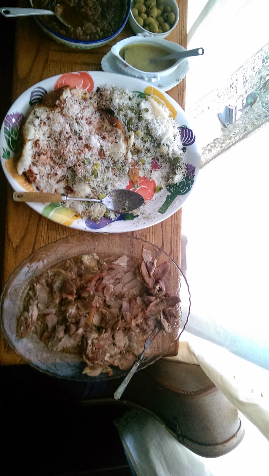 My mom cooked almost everything, but I roasted the kid with salt, pepper, olive oil and fresh crushed garlic. It was tender and mild and tasted a lot like lamb. I made a sauce with onions and plums to go with it. I don’t think it turned out exactly Persian – it was one of the only recipes we could find. For some reason there are hardly any Iranian recipes that come up on Google. But everyone was very kind and polite about it. Our friends brought rice (we were glad because they are particular about how it turns out) and fresh herbs. It was wonderful to have everyone together, hearing Farsi spoken, and learning more about their culture.