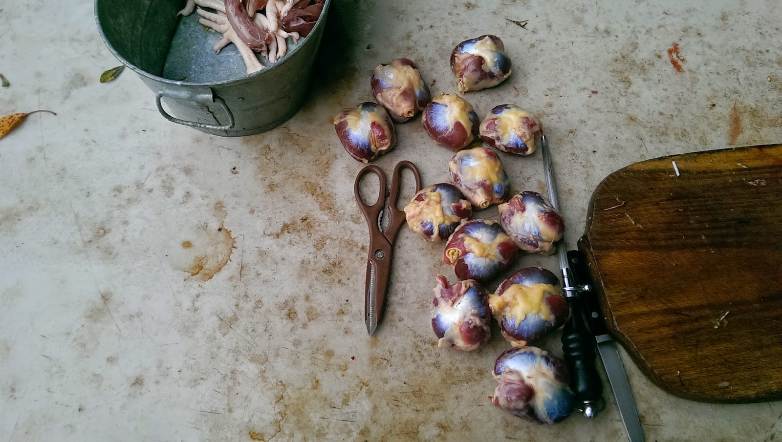I think a lot of people who process their own chickens have a nice, snug sheltered spot where they can snub their noses at the elements, but we don’t. All we have is a folding table, a spigot, and a cast-iron bath tub. Not very high-tech. I suppose it stays cleaner that way, with all the rain and sun. There weren’t any flies to be seen on Friday! They were all smart enough to find shelter. We are also lucky that it was so warm, even being soaking wet was not unpleasant. It was refreshing.