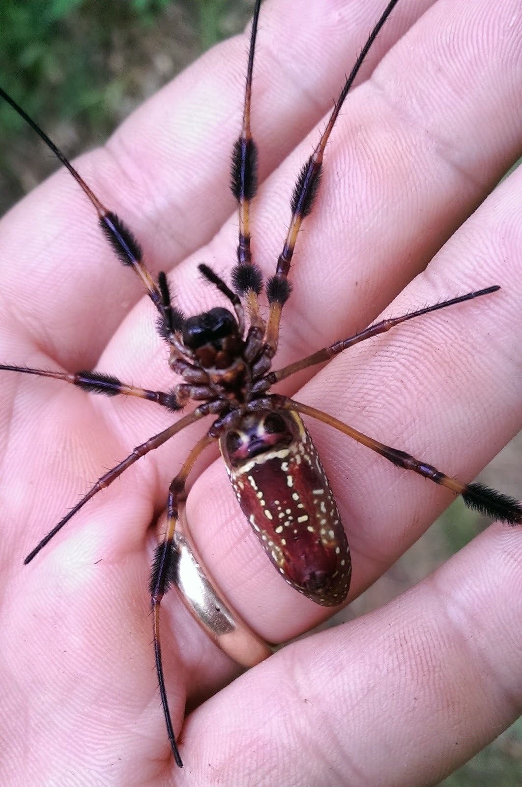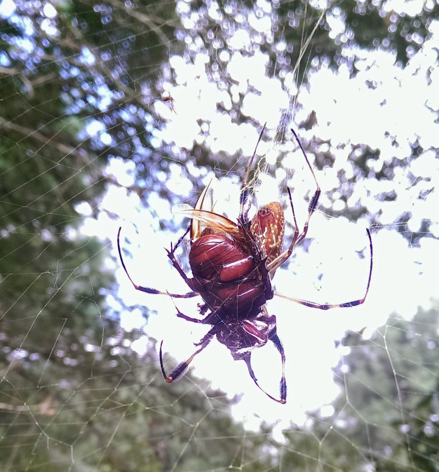 This one here had woven a massive web that stretched about twenty feet from an oak tree to a black cherry by the orchard, and was rewarded with a big, juicy rhinoceros beetle.