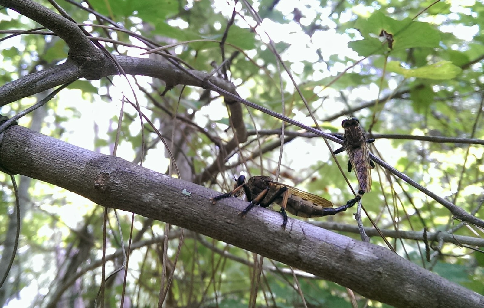 This is a mating pair of robber flies. They look pretty creepy, but they are great and eat all sorts of annoying insects. I’ve never seen a pair like this before.