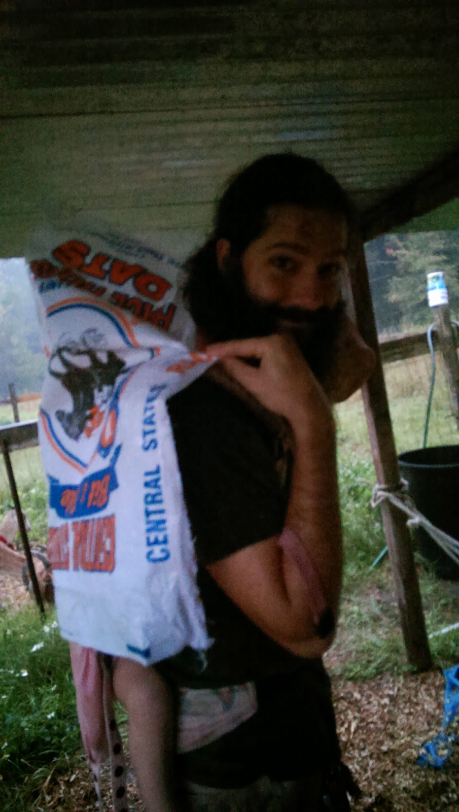 We got rained out again at the farm on Saturday. I don’t think I’ve ever been caught in that much rain before. In the five seconds it took to run to the truck and find my hat, I was completely soaked to the skin. Ethan resorted to making a rain shelter for Clothilde on his back out of old oat bags: