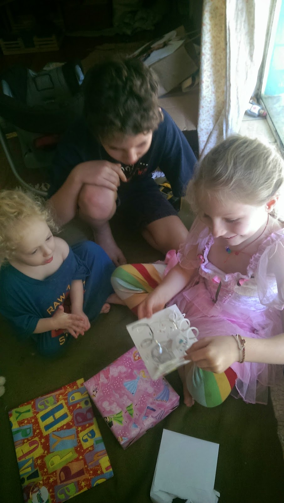 (This is Rose opening a card and presents we got in a mysterious package that arrived last week – Thank you, Dinah!! She has already made a necklace with the beading kit!)