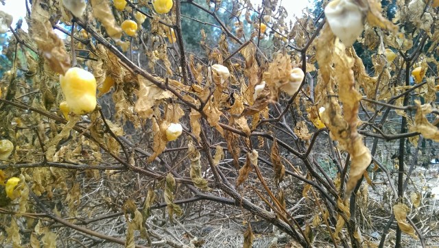 In the garden the old pepper bushes were still loaded with peppers, like colorful Christmas ornaments in the crispy branches. There was no one to pick them before the frost.