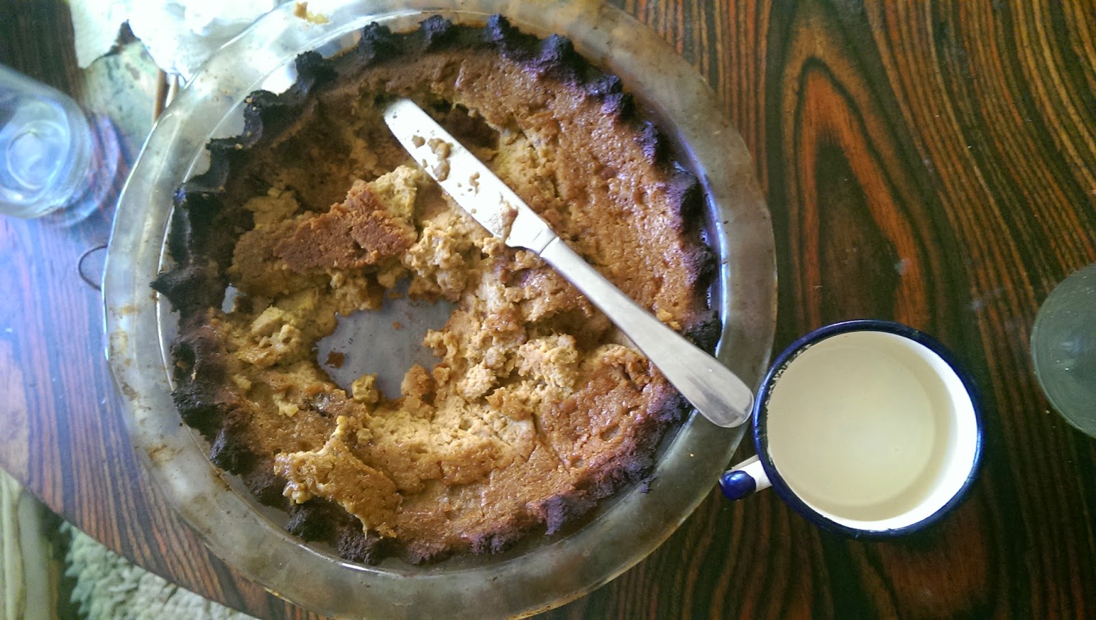 It had turned out of the oven to be such a nice pumpkin pie. It had grain-free gingerbread crust and it smelled amazing. I was just in the other room, lying down for a few minutes and trying to recover from this past week’s waking at 3am with intense head congestion that made returning to sleep impossible. I had my ear out for Clothilde the whole time. She was so quiet and happy, I should have known, but I forgot I had left the pie cooling there. All I could hear were little clinkings from her cup and other dishes, and some intense toddler breathing. She must have downed at least half of it. All that was left were little scrapings of crust and a couple of inches around the edges. The little bits that were left were exceptionally good, at least.