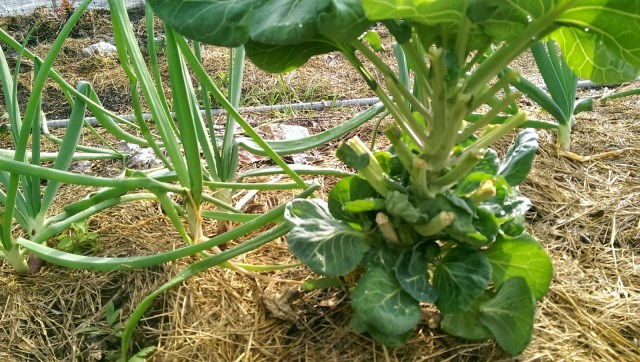 The onions are doing well….and the rabbits left me ONE Brussels sprout plant at least. It’s doing something strange with it’s leaves. I think it’s trying to make Brussels sprouts. I’ve never been able to grow them to this point. Either they get frozen or a rabbit eats them usually, so I’m interested in seeing what happens.