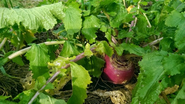 The turnips seem to have swelled into big turnips. I pulled a bunch of them and re-planted the row. They are nice and sweet this year.