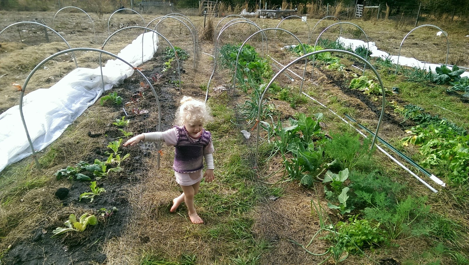 I forgot to do a garden post last week! But the garden new is good news – everything is green and growing. No more rabbit damage so far. I planted a whole row (the one Clothilde is tugging on) of new lettuce starts from Forage. Melissa Desa gave out starts for many different lettuce varieties for people to try. I have Crisp Mint, Forellenschluss, Drunken Woman, Red butter head – or something like that, anyway. I think I got six different ones. They look happy to be planted.