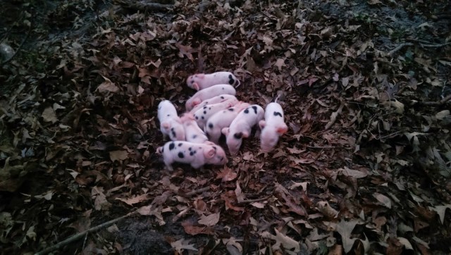 She had TEN piglets! That’s a lot of newborn babies to look after! She is an excellent mother, and made the sweetest little nest in the fallen oak leaves. When she lays down with them, she fluffs the nest up. Because there are so many piglets, this time not everyone can find a nipple as easily as when there were only five, and their frustrated squealing distresses her a little. It’s funny how whining is a cross-species phenomenon. There are so many of them, it’s hard for her to shift around so they can all get nipple coverage.