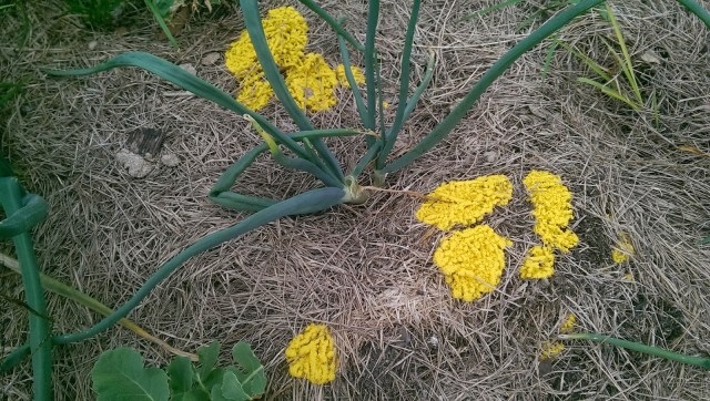 It looks like daffodils, but it is a lovely slime mold in the garden near the onions. They love the compost beds! At least it adds some lovely spring color. They, too, are flowers, in their own way.
