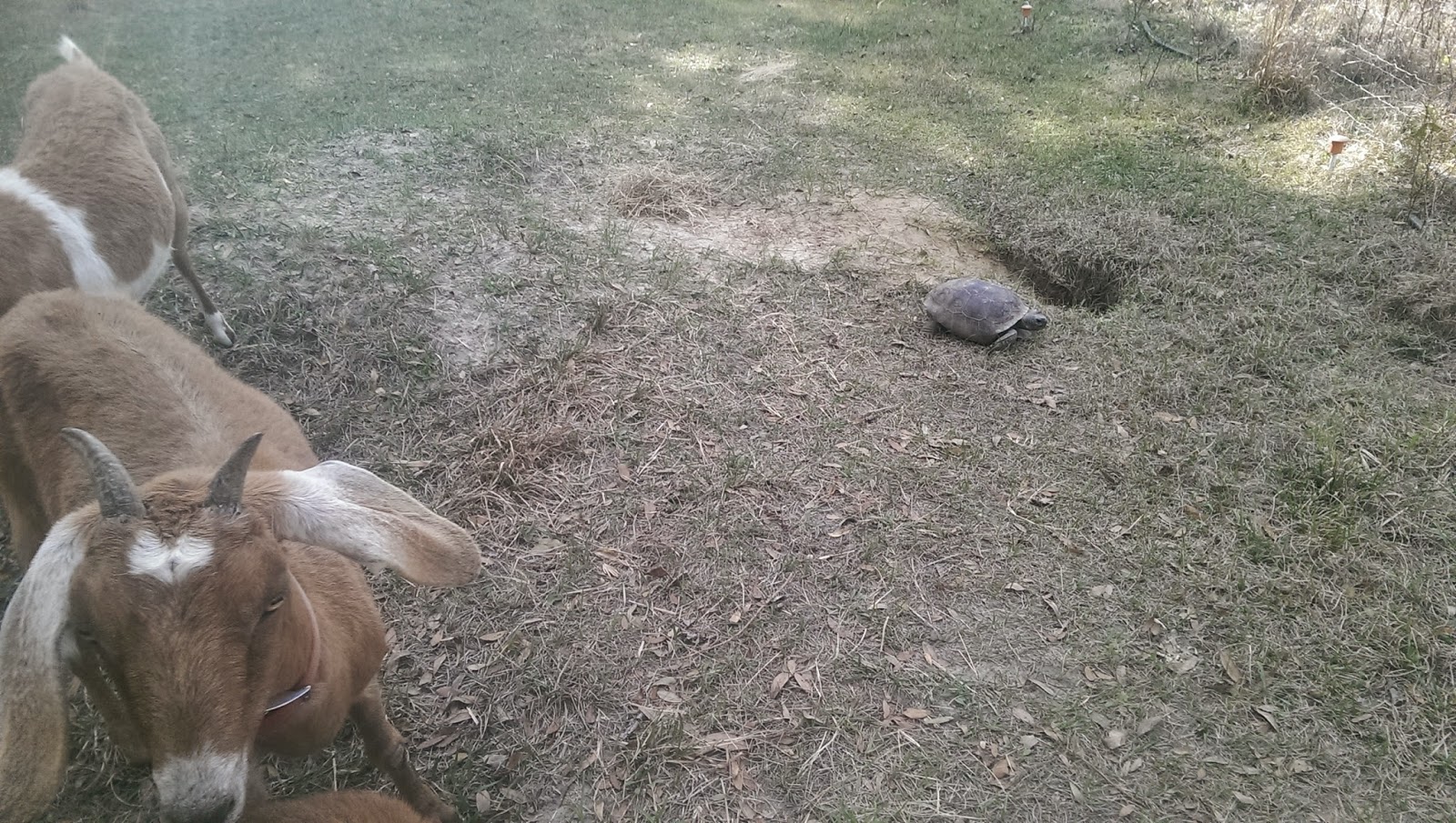 Even Ms. Gophy, the gopher tortoise, has been out and about. You can see that she has been spring-cleaning her burrow, pushing all the sand back out again that washed in from the rain. I have been seeing her when I bring the goats down and back again to be milked. She hisses at us, and scudders down her hole again. She doesn’t approve of us lumbering giants.