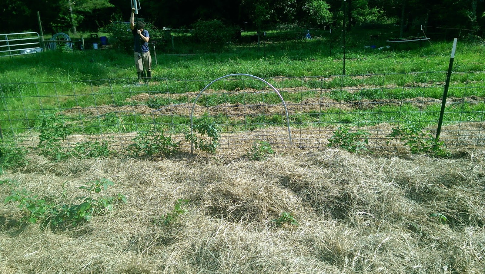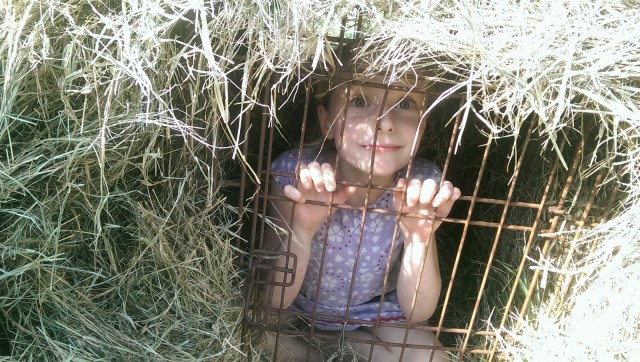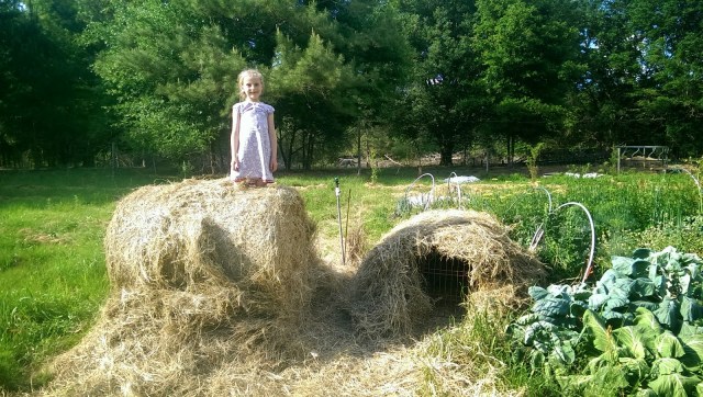 We rolled in a hay bale to mulch between the rows. The cage has been re-purposed into a hobbit hole. All three of them spent hours playing in it yesterday while we worked in the garden. It’s better than a television or an ipad.