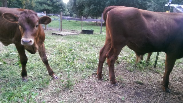 In the end we managed three gallons of milk yesterday, and sore wrists, and the calves are (as far as I know) still weaned. Not too bad, but I can’t help feeling like this whole milking thing is more than I can manage. The ancient Egyptians started off milking antelope. They must have been crazy. I always feel like this when we first start milking again. The goats seemed like this, and now they are good as gold and jump up in the milking stand, eager to be milked.