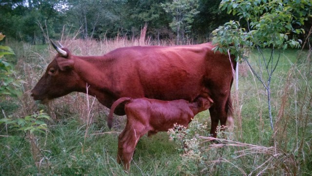 At last, a picture of Flora’s new calf! We’ve hardly seen him. He hides until he has to nurse. They are both doing well. It’s hard to tell now that the other calves are so grown up, but he seems like a rather large calf.