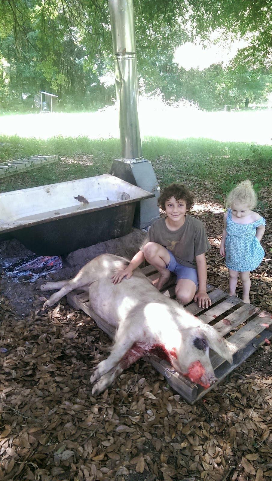 Exhausted. We harvested two of the big pigs. It really isn’t the best season to harvest pigs, usually the coldest part of the years is best, but we are downsizing everything for when we are in Europe and my mom is taking over for two weeks. I was already tired from chasing stupid Sappho around (Ethan has been calling her “Sapphole.” I’ve been thinking of veal). The good news is that she was still weaned when we got out there.