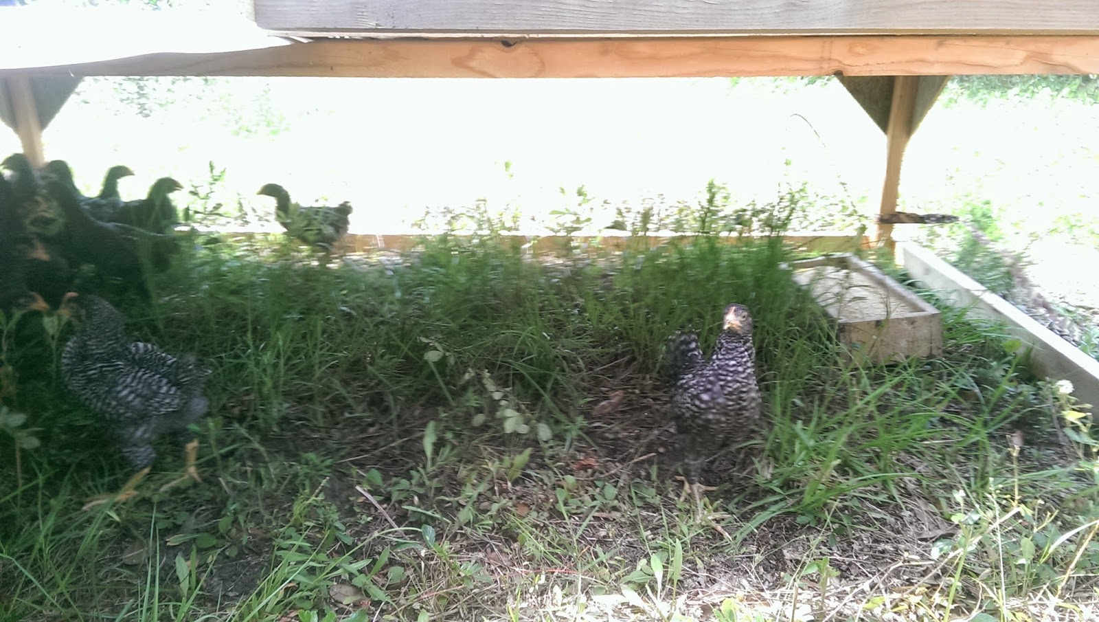 The baby chicks are thrilled about their new moveable coop. They look so tiny in it. These are the next batch of laying hens. As much as I like the beautiful eggs from the Americaunas, they always have problems, and are really mean to each other. We went with Barred Rocks again this time, because they are just really good chickens. Intelligent and healthy. We need chickens like that right now, because we don’t have much time to baby them.