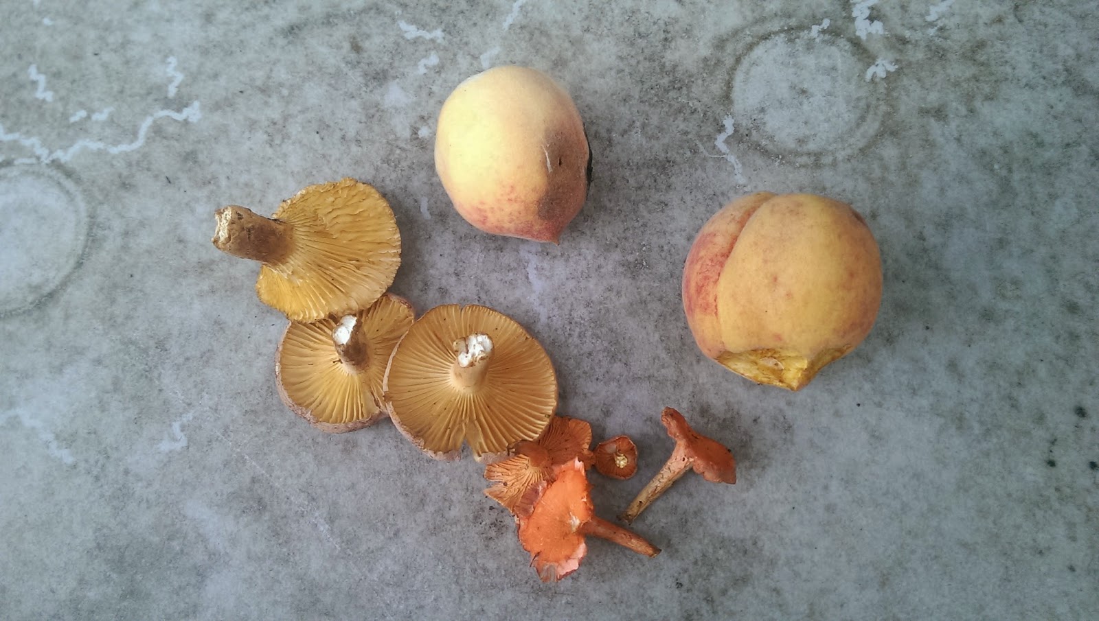 Mirin found some Lactarius and Chantarelle mushrooms, and we got a few peaches. Not a good year for peaches, because of that last late frost that got all the blossoms.